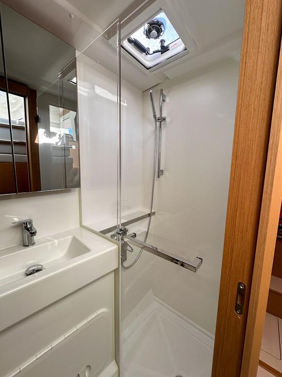 elektrische Ankerwinde, Außendusche, Roll-Genua, Bimini, Bilgenpum, Anker, Kaffeemaschine, Gangway, Elektrische Bilgepumpe, Abwassertank, Gasflasche, Außenlautsprecher, Dusche an Deck, 12-Volt-Stecker, 220-Volt-Stecker, Notpinne, Erste-Hilfe-Set,  Rettungsinsel, USB-Anschluss, AIS, elektrische Toilette